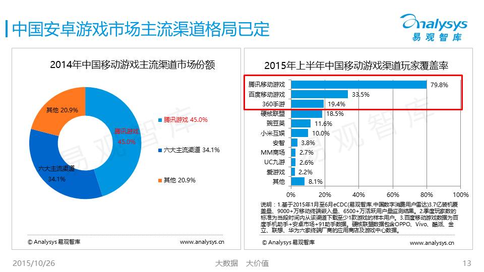 此外,各项数据均表明中国移动游戏市场马太效应愈发突出,在游戏畅销榜发行商的市场竞争上,腾讯游戏独占43.14%位列第一,前9的发行商共占掉83.29%的市场份额;而安卓游戏渠道的格局也已基本敲定:腾讯占45%,六大主流渠道占34.1%。