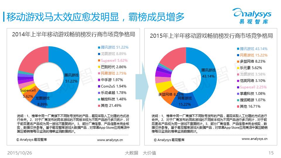 各项数据均表明中国移动游戏市场马太效应愈发突出,在游戏畅销榜发行商的市场竞争上,腾讯游戏独占43.14%位列第一,前9的发行商共占掉83.29%的市场份额;而安卓游戏渠道的格局也已基本敲定:腾讯占45%,六大主流渠道占34.1%。