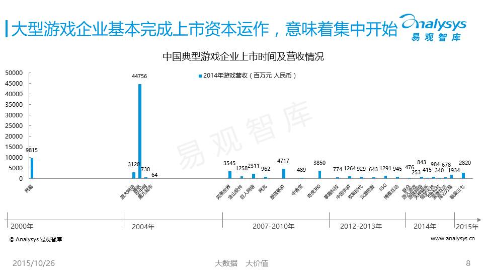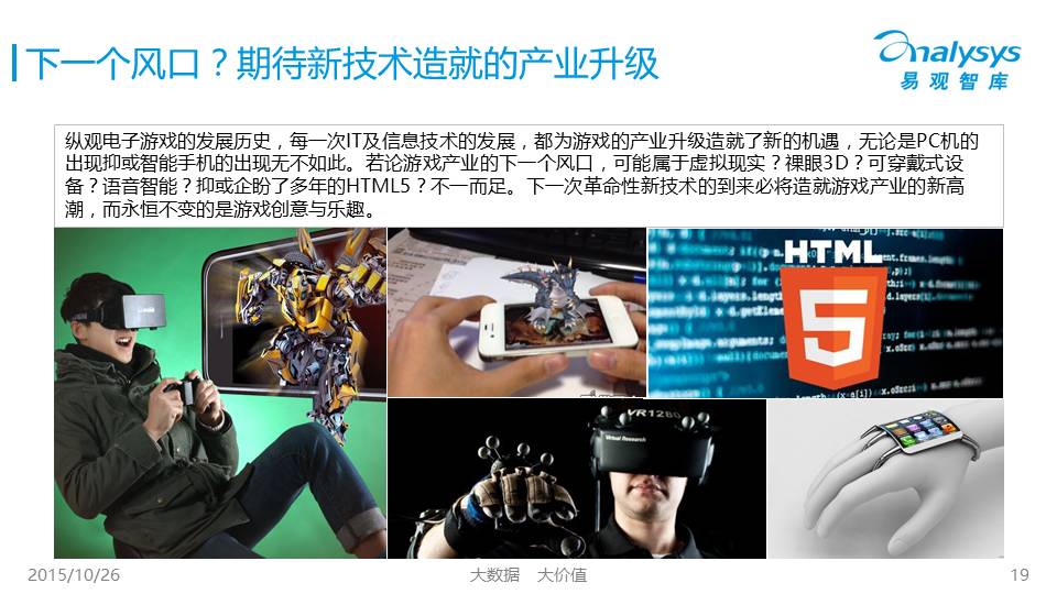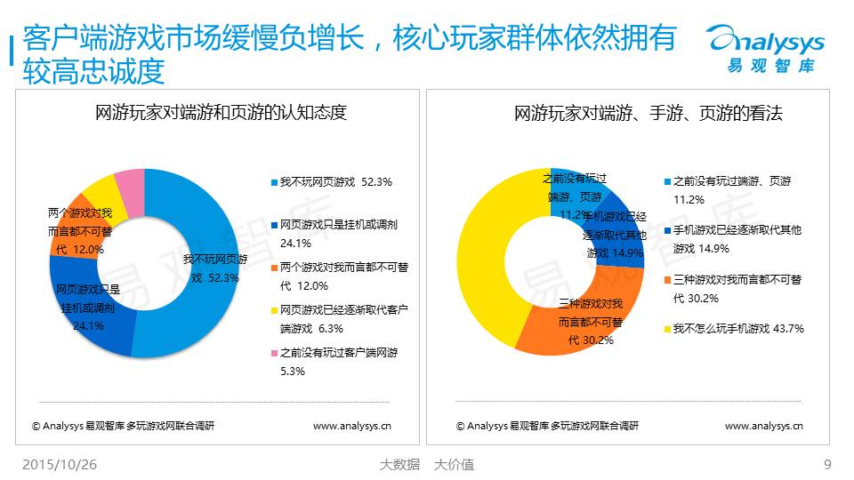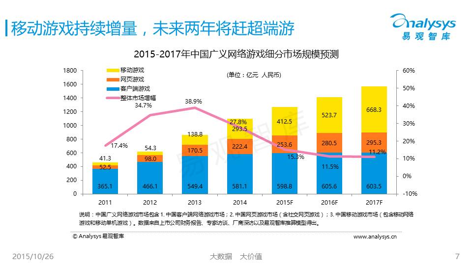 10月26日,易观智库发布了《中国互动娱乐产业趋势研究报告2015-2016》,报告分析了中国的游戏市场。数据显示,中国的移动游戏持续增量,预计未来2年便将赶超端游;端游虽然呈现缓慢负增长,但核心玩家群体依然拥有较高的忠诚度。