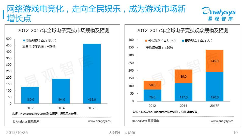 值得关注的是,网游电竞化正在成为游戏市场新的增长点,预计到2017年,全球电子竞技市场规模将增至465百万美元(约2953万人民币)。