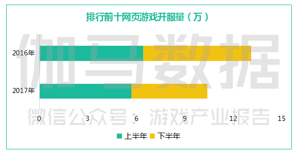 中国网页游戏开服数量的降低,也说明其市场规模仍在萎缩。报告显示,今年排行前十网页游戏开服量约10万,相对2016年下降3万。同时,今年一线平台发行网页游戏开服量约29万,相对2016年减少1.6万。两方面的数据下降情况均能够佐证网页游戏市场的发展情况。