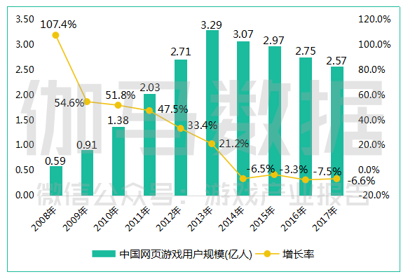 中国网页游戏的用户数量也印证了其正处于下降趋势。报告显示中国网页游戏用户规模达2.57亿人,同比下降6.6%,而今年是网页游戏用户数量连续负增长的第四年。